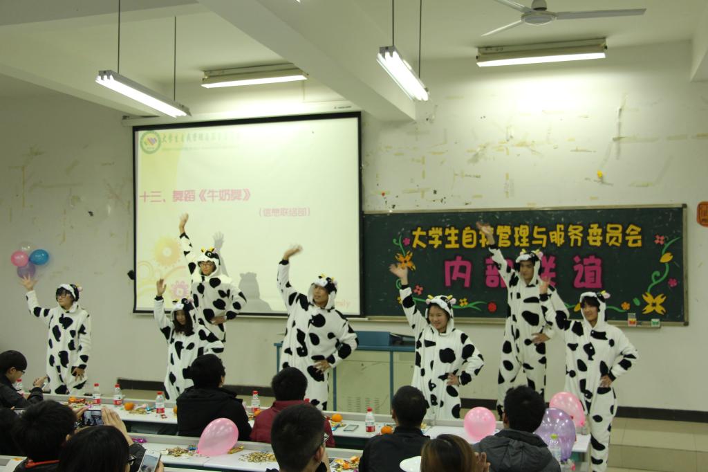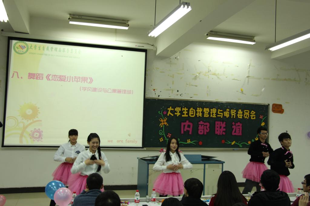 (学生记者 杨科)2014年12月7日晚上6:30,我院大学生自我管理与服务委员会(以下简称大自委)内部联谊于10403教室顺利举行。学生处范雪林老师、第三届大自委主席团以及所有部长和干事参加了此次联谊。