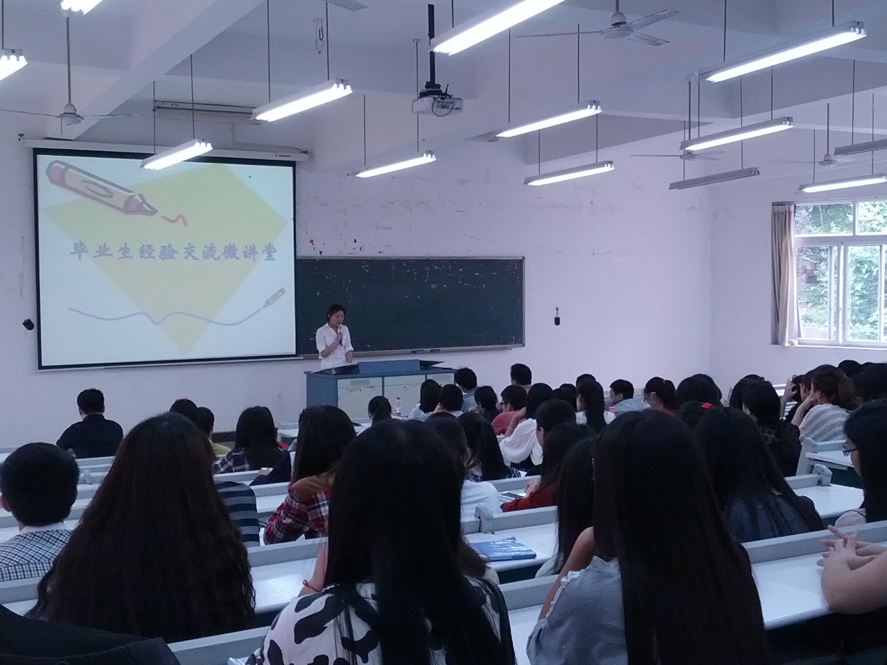 2014年5月14日下午3:50,经济系毕业生经验交流微讲堂活动在10403教室举行。活动由经济系专职辅导员冉光波、杨邓旗组织,邀请了今年即将毕业的四名同学:2010级会展一班郑银屏、金融一班唐艳芳、贸经一班吴新洪和廖白发,与2013会展专业、2011级会展专业、贸经专业、国贸专业的学生分享了毕业生工作、考研和创业的先进经验和做法。活动由冉光波老师主持。