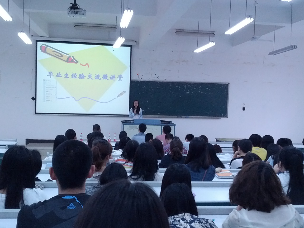 吴新洪同学从心态调整和专业选择两个方面向同学们介绍了自己考研的经验。在介绍了自己大学四年的求学经历后,他结合自身情况向同学们介绍了在考研和就业之间应该如何选择的问题,之后建议有考研打算的同学一定要抱定一颗平常心,注意劳逸结合,并且建议同学们根据自身的职业规划、学习情况和专业背景,合理选择报考院校和专业。